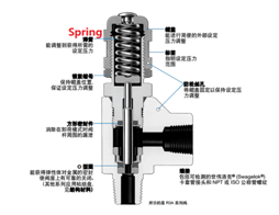 卸压装置 可更换弹簧来调整安全范围 A 弹簧 3、4-24、1 Bar B 弹簧 24、1-51、7 Bar C 弹簧 51、7-103 Bar D 弹簧 155-206 Bar E弹簧 206-275 Bar F 弹簧 275-344 Bar G弹簧340-413 Barr 当超过设置压力范围后,通过泄压阀会自动放气到设定压力值
