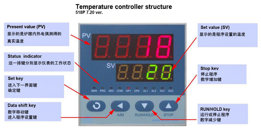 采用宇电程序控温仪表(标配) 1、30段程序控温智能PID调节。 2、具有过温保护 断偶保护过温或断偶时电炉加热电路自动切断,,(当电炉温度超过1200度或热电偶烧断时,主电路上的交流继电器会自动断开,主电路断开,面板上ON灯熄灭,OFF灯亮,有限的保护电炉)。 3、带有485 通讯接口(选购软件时标配) 4、具有断电保护功能,即断电后再给电启动炉子时、程序不是从起始温度开始升、而是从断电时炉温开始升。 5、仪表具有温度自整定的功能
