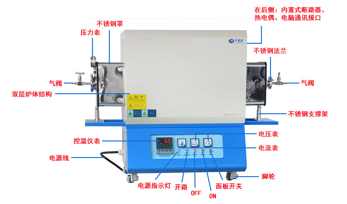 有温场均衡、表面温度低、升降温度速率快、节能等点,是高校、科研院所、工矿企业做高温气氛烧结、气氛还原、CVD实验、真