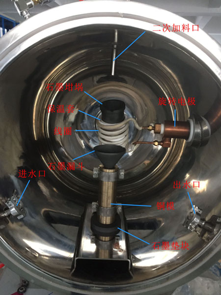 4、二次加料装置:炉体上部配有二次加料装置,可以实现在熔炼过程中加入其它元素。